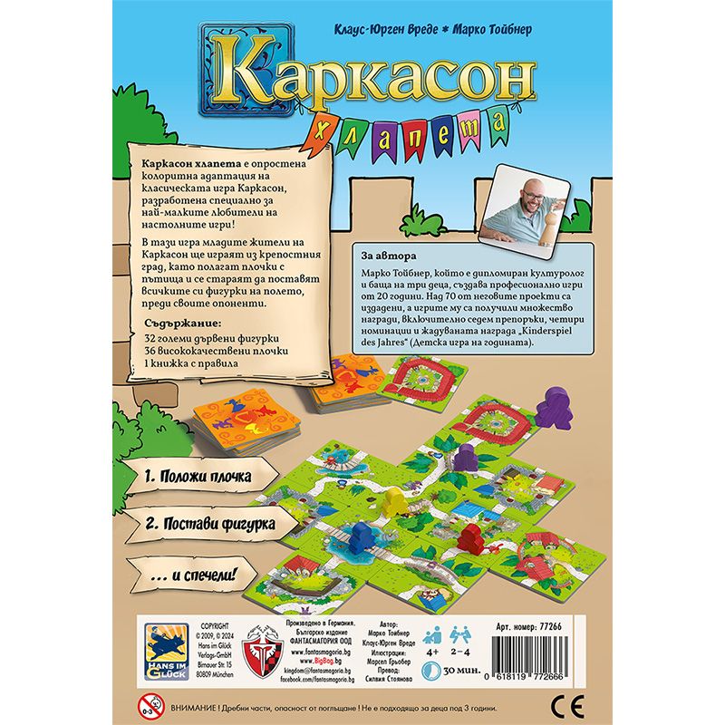 Каркасон хлапета е опростена колоритна адаптация на класическата игра Каркасон, разработена специално за най-малките любители на настолните игри!