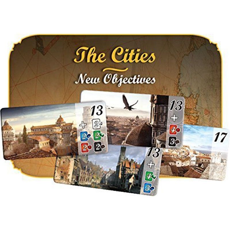 The Cities replaces the noble tiles with 3 different city tiles (randomly taken from a pool of 14). The city tiles are objectives (in prestige points and/or development cards) and you need to fulfill one of them in order to win.