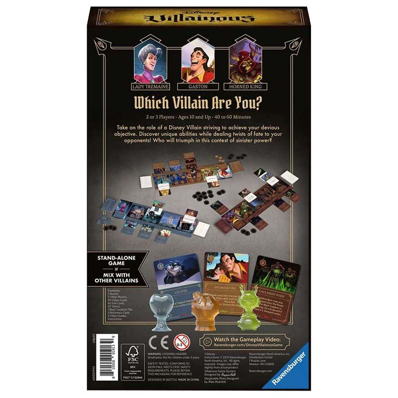 In Villainous: Despicable Plots, each player takes control of one of three Disney characters, each one a villain in a different Disney movie, specifically Lady Tremaine (Cinderella), the Horned King (The Black Cauldron), and Gaston (Beauty and the Beast). Each player has their own villain deck, fate deck, player board, and 3D character.