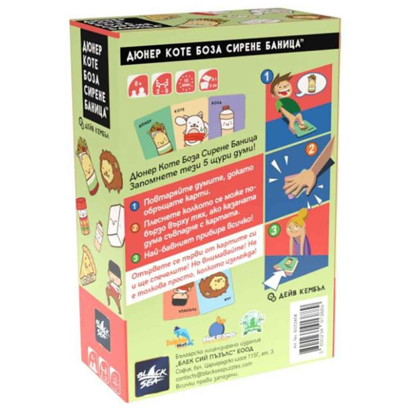 Дюнер Коте Боза Сирене Баница e забавна и динамична парти игра, която ще се харесва както на малките, така и на по-големите играчи. Името ѝ далеч не е случайно. Първата стъпка от правилата е именно да запомните поредността на думите "дюнер, коте, боза, сирене, баница". Сега остава само да тествате рефлексите и бързината си!
