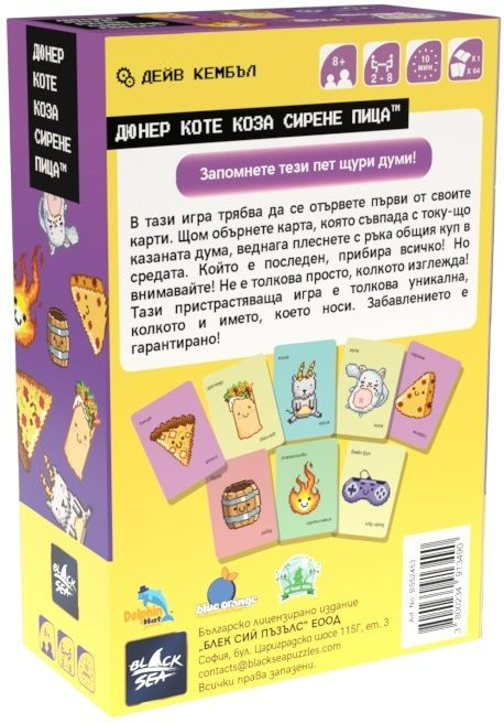 Дюнер Коте Коза Сирене Пица: 8-битово издание и динамична парти игра, която се харесва на малки и големи играчи. Името ѝ далеч не е случайно. Първата стъпка от правилата е именно да запомните поредността на думите "дюнер, коте, коза, сирене, пица". Сега остава само да тествате рефлексите и бързината си!