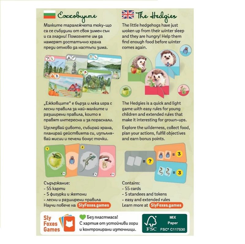Малките таралежчета току-що са се събудили от своя зимен сън и са гладни! Помогнете им да намерят достатъчно храна преди отново да настъпи зима. „Ежковците“ е бърза и лека игра с лесни правила за най-малките и разширени правила, които я правят интересна и за пораснали.