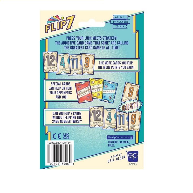 Sound easy? Think again! This isn't just any deck of cards… In Flip 7 there's only one 1 card, two 2's, three 3’s, etc plus a bunch of special cards that can score you extra points, give you a second chance, or freeze you or your opponents in your tracks.