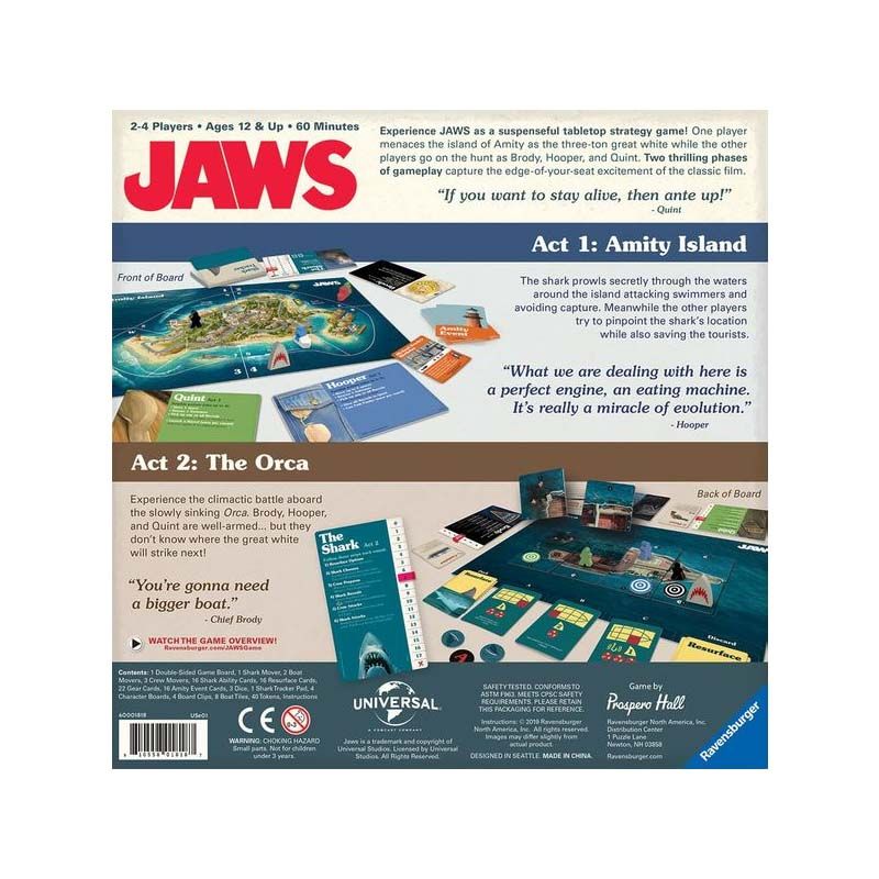 In JAWS, one player takes on the role of the killer shark off Amity Island, while the other 1-3 players take on the roles of Brody, Hooper and Quint to hunt the shark. Character and event cards define player abilities and create game actions for humans and the shark. Gameplay is divided into two acts — Amity Island and The Orca — played on a double-sided board to replicate the film's story: