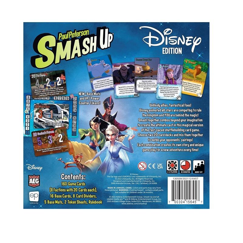 In Smash Up: Disney Edition, players choose two decks of fan-favorite Disney factions and combine their powers to take over bases, earn the most points, and win! Choose two from Frozen, Big Hero 6, Wreck-It Ralph, The Lion King, Mulan, Aladdin, The Nightmare Before Christmas, and Beauty & the Beast to create the most exciting team-ups imaginable!