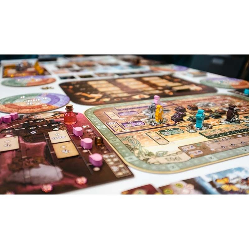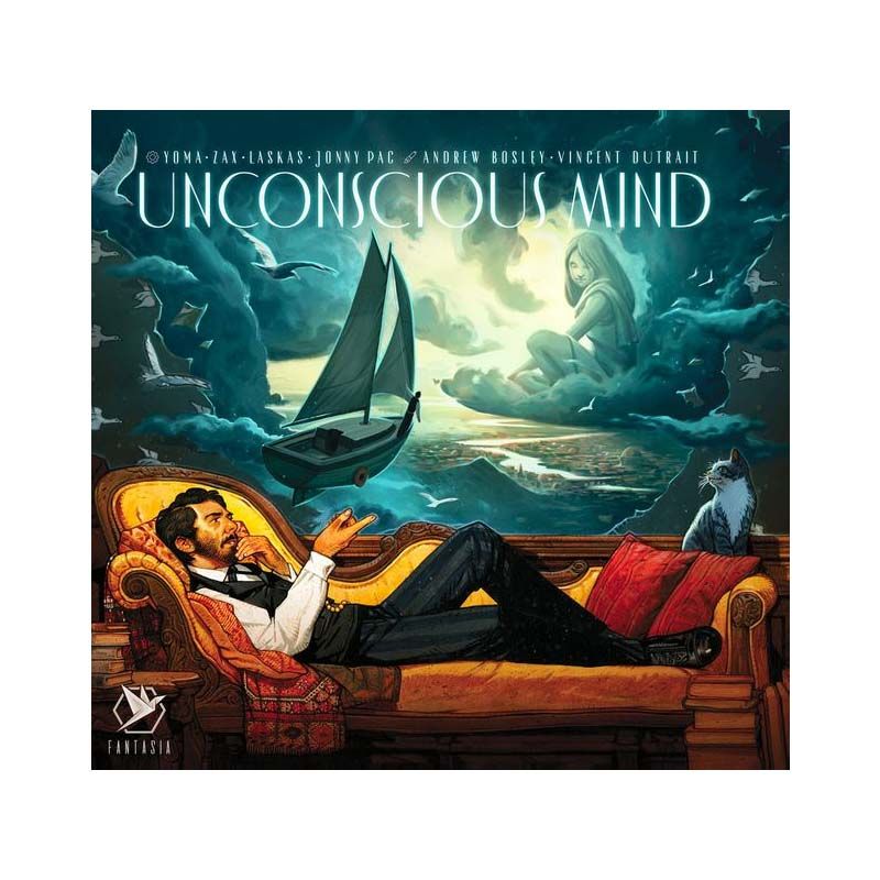 Unconscious Mind is a euro-style game featuring worker placement, engine building, multiple rondels, and cascading effects. On your turn, you may place one or two Ideas (workers) on a central Meeting Table to access a variety of actions, such as adding tiles to your player board, drafting and playing cards, and moving around the city of Vienna. Where you place your Ideas also determines how far to advance your rondel’s inkpot, activating a row or column of tile effects on your player board.