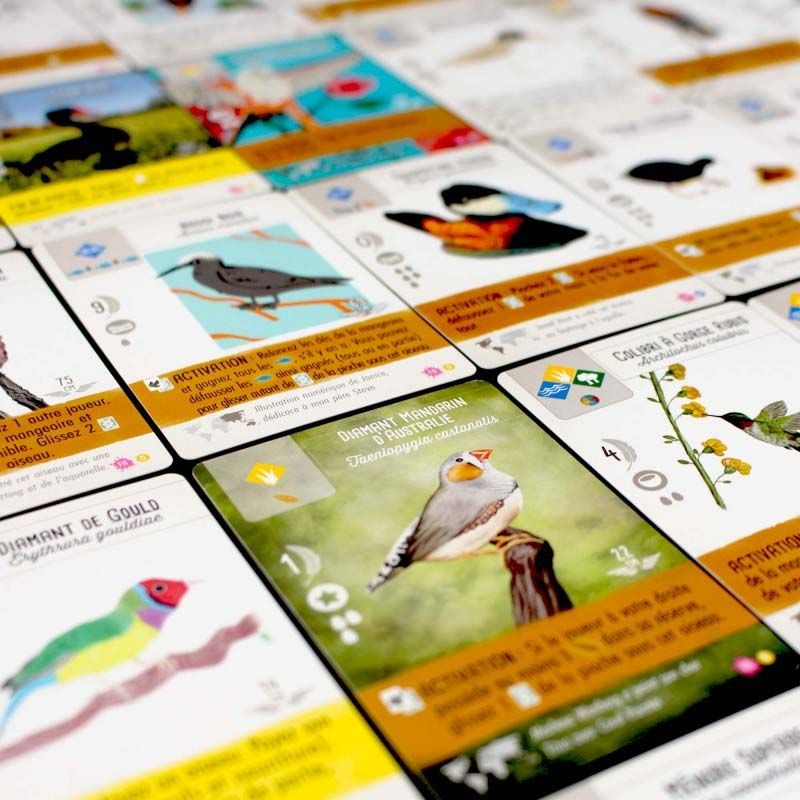 The box for the cards is designed both for storage and recyclability; it will fit in the bottom layer of the Nesting Box. You can shuffle the cards into your standard Wingspan set, select some cards to replace the cards you have (there are 446 total unique bird cards in Wingspan compared to 255 fan-art birds), or play games only with these birds (their percentages correspond closely to those noted on bonus cards).