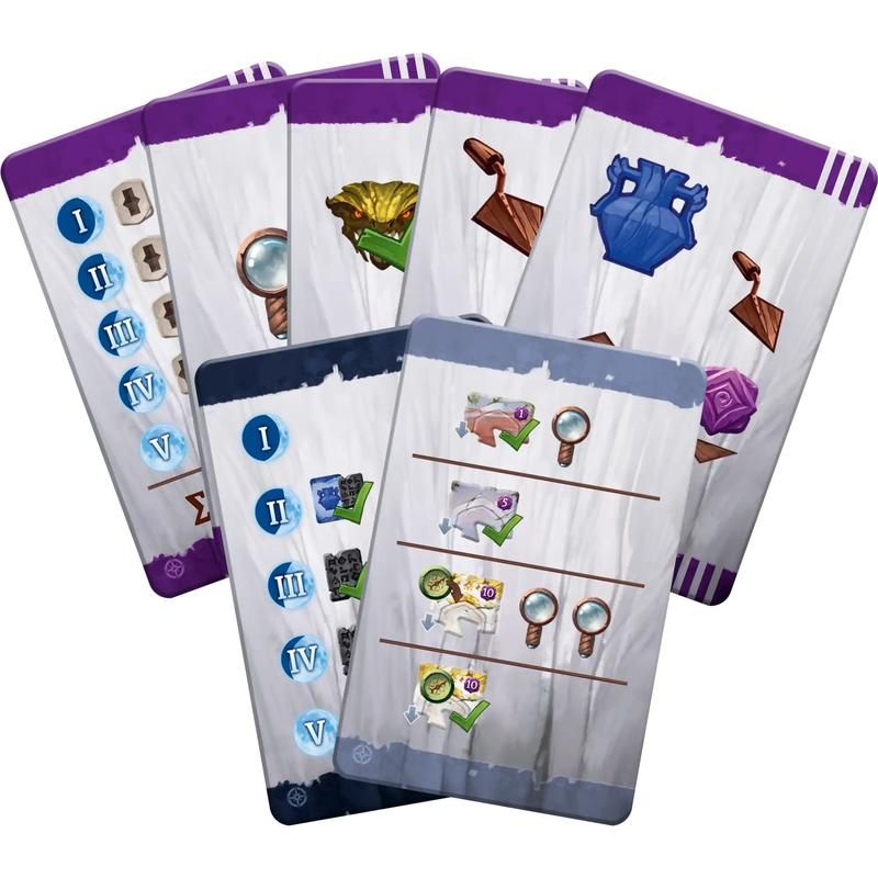 On the map, you can choose to explore its daytime side and scale the white stone of the Owl Temple. It uses unique new temple tiles that, if combined together, can become extra idol slots, and a third research token, a lantern, that brings even stronger research rewards. You can also brave the night and journey through the dark caverns of the Spider Temple. This side uses a new resource, dark tablets, used to invoke mysterious altars and place artifacts directly onto the research track to be used when ascending the track. But beware—using the dark tablets can give you strong rewards, but also cost you points should you become too ambitious!