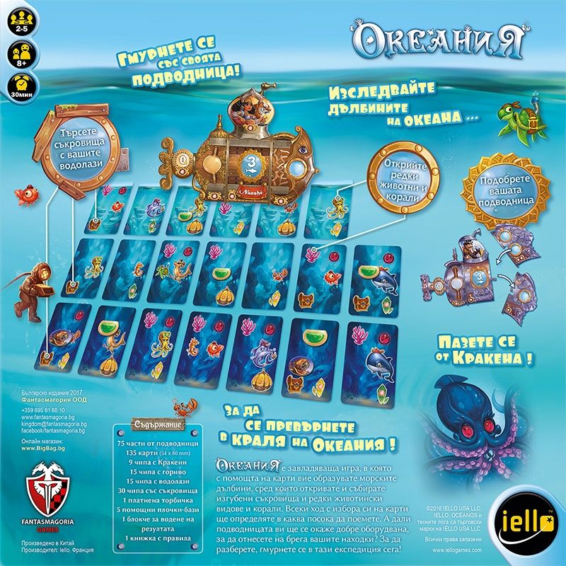 Океания ще ви поведе на пътешествие към морските дълбини, където вие влизате в ролята на изследователи, които управляват собствена подводница. Уловете най-невероятните животински видове, изследвайте най-големите коралови рифове, открийте отдавна изгубени съкровища! не забравяйте да правите нужните подобрения по вашата подводница, ако искате да отнесете бързо и сигурно всичките си открития на сушата. И най-важното - пазете се от проклятието на кракена, защото митичното морско чудовище дебне отвсякъде!