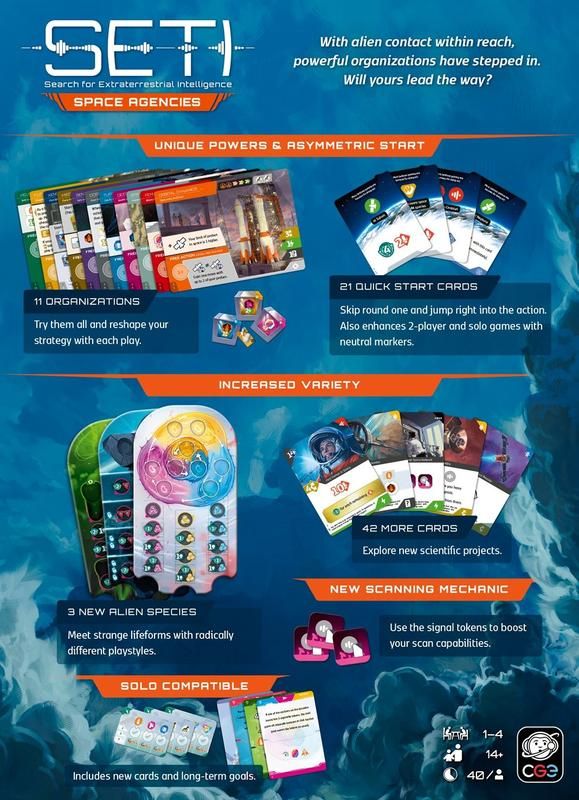 SETI: Space Agencies, разширение за SETI: Search for Extraterrestrial Intelligence, представя мощни асиметрични организации – всяка с уникални способности, стратегически предимства и начални условия, които предефинират начина, по който подхождате към търсенето на извънземен живот.
