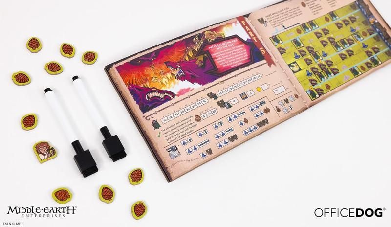 With your chosen dice, you use a dry-erase pen to mark the current chapter of your book, drafting a path to evade trolls, battle goblins, solve riddles, and pen the best conclusion to each chapter. The game takes players through the eight most iconic challenges faced by Bilbo and the Dwarves in The Hobbit, such as overcoming trolls, goblins, wargs, and giant spiders; reclaiming the treasure of the dwarves; and defeating the dragon Smaug. In the end, you want to complete the most rewarding journey to The Lonely Mountain.